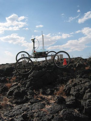 Research rover built for a proposal on exploration of the lunar Copernicus craters. Man in the loop drive system, with signal degradation capabilities for simulating light time delays, bandwidth issues, etc... Built to run on a mobile polarized projection setup, providing the driver with a 3D view while also being easily deployable from a large vehicle.