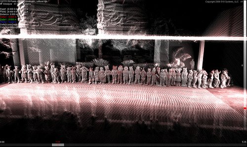 This cloud is made up of 5 million points, about the maximum the House of Cards Renderer (see the Available Software Section) can handle before choking. We call this number our point budget. Now, you're probably saying /"BUT I CAN RUN THE CRYSIS ENGINE AT MAXIMUM WHY CAN'T I RENDER MANY POINTS WAAAAAAAAAAAAAAH."/. Well, get ahold of yourself. When rendering point clouds, it's a completely different ballgame. Since the points are disconnected, you can't use point indexing. Since there's no polygons, there's none of the pipeline optimizations inherent in using triangles. Of course, there's solutions for these problems, mainly having to do with spacial data structures and compression that can easily deal with hundreds of millions of points, but since the easiest way for everyone on every platform to view the clouds was using the prewritten, Processing (and therefore java) based House of Cards viewer… Well, there you go.