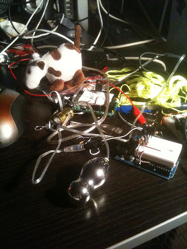 A one-day workshop to teach students the basics of the Arduino and Processing platforms, as well as simple electronics and mechanics. Instead of using the normal approach of teaching via a chain of simple projects like making LEDs light up or doing abstract generative software art, the students are taught to build their own USB controlled vibrator. They then set about building different control interfaces for the hardware they built.